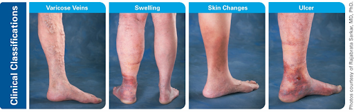 In healthy functioning veins, small valves inside of the vein allow blood to flow in one direction back to the heart. Chronic venous insufficiency is a medical condition where these valves become damaged or weakened and do not close properly which allows blood to flow downward back into the vein. This is also called venous reflux, which results in blood pooling in the legs and ankles and the veins to bulge. Common symptoms of chronic venous insufficiency may include varicose veins, pain, swelling, itching, and flaking skin, skin discoloration, heavy legs, restless legs, and skin ulcerations.